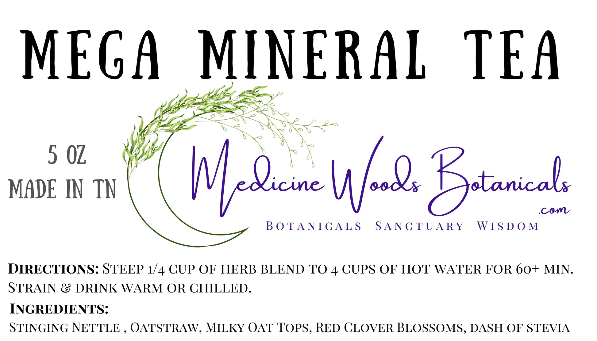 Our Mega Mineral Tea combines nettle, oatstraw and tops, and red clover—three of nature's most nutrient-dense botanicals—with a touch of stevia for natural sweetness. This carefully crafted blend delivers a rich spectrum of minerals and health benefits including anti-inflammatory support, bone and skin nourishment, and gentle detoxification.