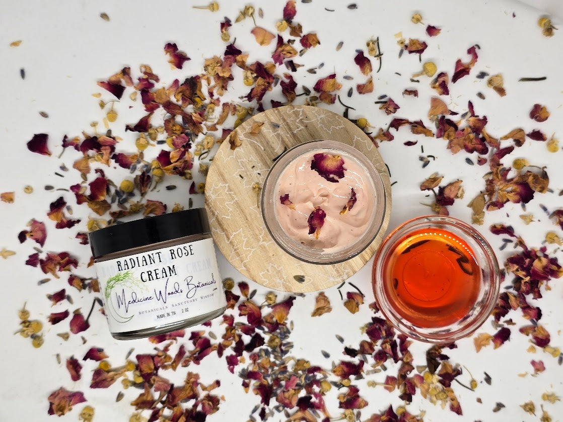 Our ultra-luxurious yet light cream utilizes several skin-loving florals. Made with rose of course, it's rich in antioxidants and helps to calm, balance, moisturize and hydrate the skin.